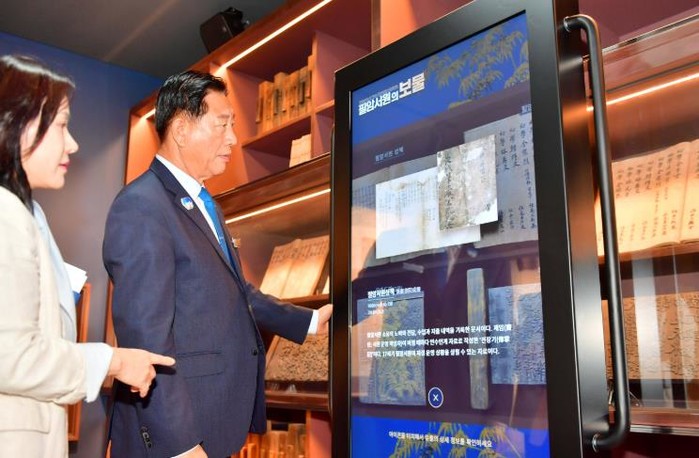 | ▲ 김한종 장성군수가 디지털 전시 공간으로 거듭난 필암서원 유물전시관에서 역사 정보를 확인하고 있다. 장성군 제공 |