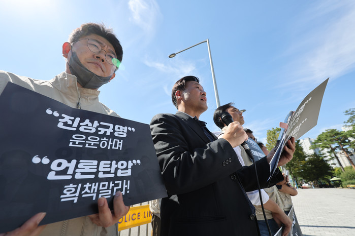 | ▲ 나준영 한국영상기자협회장이 27일 오전 서울 용산구 대통령 집무실 인근에서 윤석열 대통령의 '욕설·비속어 논란' 책임 전가 규탄 현업언론단체 긴급 공동기자회견에서 발언하고 있다. 2022.9.27 |