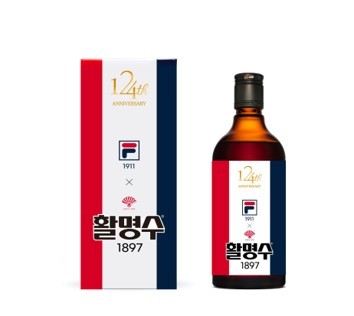 활명수 124주년 기념판은 각 브랜드의 대표 컬러를 활용해 스포티하고 경쾌한 느낌을 담았다. 부채표의 레드와 휠라의 브랜드 컬러인 네이비 색상을 병의 라벨과 패키지 양 옆에 배치해 마치 휠라의 운동화가 연상되는 심플하고 클래식한 디자인을 적용했다. 또한 상단에는 활명수 탄생 124주년을 기념하는 ‘124th Anniversary’ 표기도 새겨졌다.