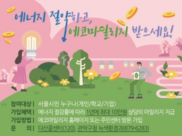 [열린의정뉴스 = 이창희 기자]서울 관악구(구청장 박준희)는 가정의 에너지 사용량을 절약하면서 적립된 마일리지로 다양한 혜택을 누릴 수 있는 에코마일리지 신규 회원을 모집한다.