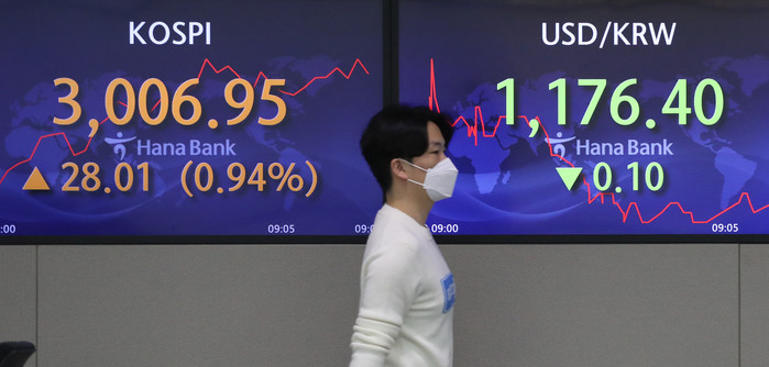 이날 오전 9시 21분 현재 코스피는 전날보다 41.21포인트(1.38%) 오른 3,020.15를 나타냈다.