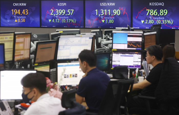 | ▲ 코스피가 하락 출발한 26일 서울 중구 하나은행 본점 딜링룸에서 직원들이 업무를 보고 있다. 이날 코스피는 전장보다 6.42포인트(0.27%) 내린 2,397.27에, 코스닥지수는 전 거래일 0.93포인트(0.12%) 하락한 788.76에 개장했다. 2022.7.26 |