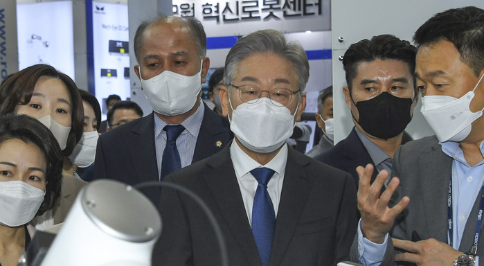 ▲ 더불어민주당 이재명 대선후보가 28일 오전 경기도 고양 킨텍스에서 열린 '2021 로보월드'에서 참가 업체의 굴절 모션 로봇 작업을 지켜보고 있다. 2021.10.28 [국회사진기자단]