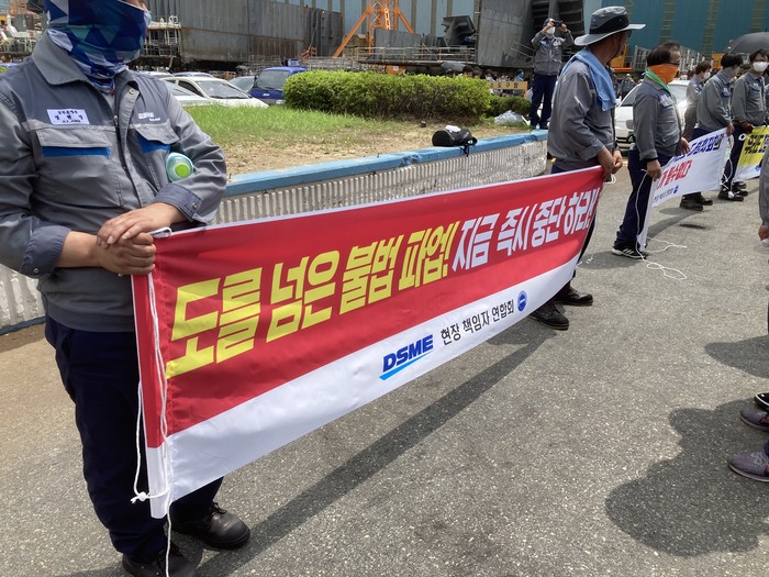 [열린의정뉴스 = 김윤영 기자] 대우조선해양 현장책임자연합회가 8일 경남 거제 대우조선 민주광장 앞에서 금속노조 거제통영고성 조선하청지회 파업 중단 촉구 결의대회를 열고 있다. 2022.7.8 [대우조선지회 제공. 재판매 및 DB 금지]