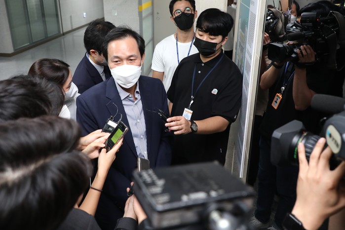 | ▲ 더불어민주당 우상호 비상대책위원장이 16일 오후 국회 의원회관에서 전당대회 준비위원회가 '당헌 80조' 개정 방안을 의결한 것과 관련한 취재진들의 질문에 답하고 있다. 2022.8.16 [국회사진기자단] |