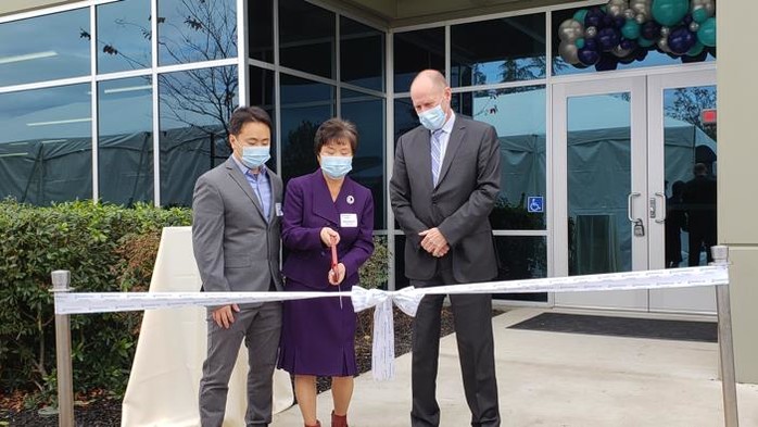 | ▲ '태마 김 메뉴팩터링센터' 오프닝 행사 장면 마이크 슬래셔 회장(사진 오른쪽)이 태마 김 부사장의 아들 김임엽 씨와 부인 김희원 씨를 초청해 테이프 커팅식을 하고 있다.[미주한국일보 제공] |