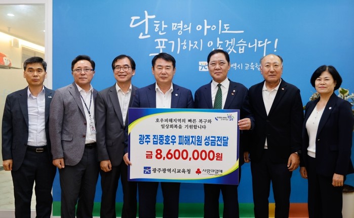 [코리아 이슈저널=김종오 기자] 광주시교육청이 12일 본청 교육감실에서 이정선 교육감과 구재길 광주사회복지공동모금회 회장, 이상철 광주 아너소사이어티 회원 대표 등이 참석한 가운데, 집중호우 피해를 입은 주민을 위해 성금 860만원을 ‘사랑의 열매(사회복지공동모금회)’에 전달했다.