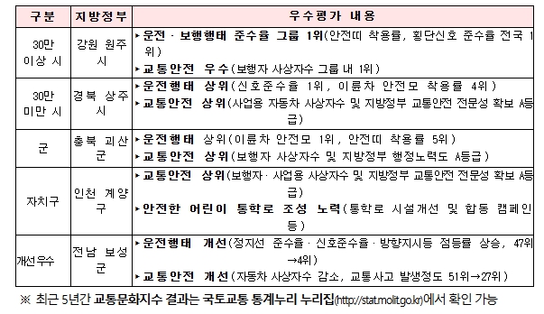 ’25년 교통문화지수 조사 결과, 강원 원주시(91.58점, 인구 30만 이상 시), 경북 상주시(87.62점, 인구 30만 미만 시), 충북 괴산군(88.72점, 군 지역), 인천 계양구(89.56점, 자치구)가 각각 1위로 선정됐다.