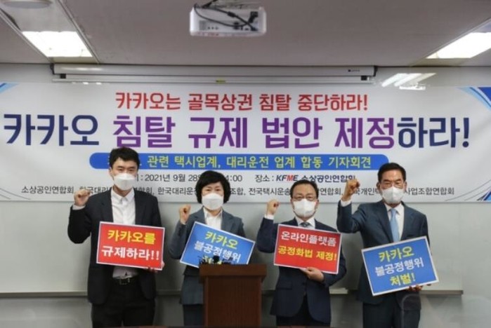 한국대리운전총연합회와 전국택시운송사업조합연합회 등 5개 단체는 28일 서울 영등포구 소상공인연합회에서 합동 기자회견을 열고 "카카오는 시장 독점을 중단하라"고 촉구했다.