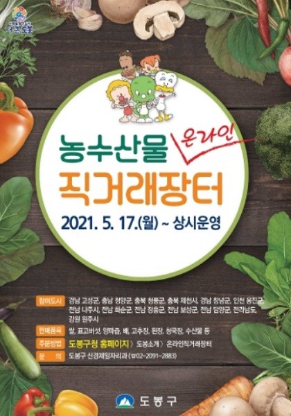 이에 구는 참여업체 농가에 판로를 제공하고 구민들에게는 편리하게 양질의 농수산물을 구매할 수 있도록 구 대표 홈페이지(http://www.dobong.go.kr, 도봉 소개/온라인직거래장터)에 온라인 직거래장터를 마련했다.