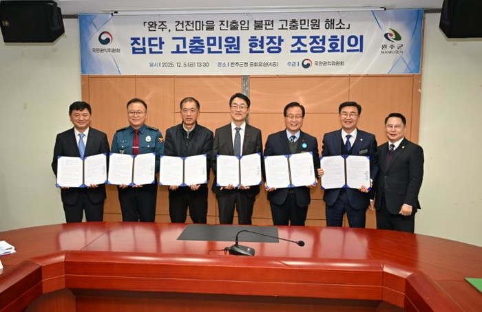 [코리아 이슈저널=홍춘표 기자] 완주군의회 유의식 의장과 성중기 예산결산특별위원장은 5일 국민권익위원회, 완주군, 완주경찰서, 전주국토관리사무소, 건전마을 주민 대표와 함께 운곡교 인근 교통 불편 해소를 위한 조정안에 최종 합의하고 공식 협약을 체결했다.