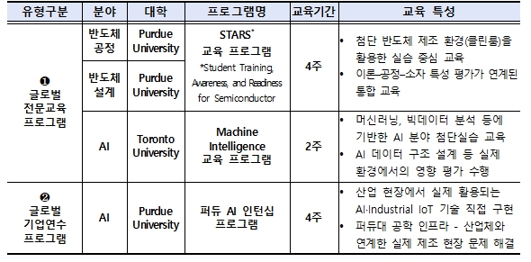 다음으로, ‘첨단분야 글로벌 교육과정 운영사업’은 국내외 대학이 공동으로 반도체, 인공지능(AI) 등 첨단분야와 관련된 해외 교육과정을 기획·운영하는 사업이다. 선발된 학생은 해외 대학에서 실습형 교육과정, 현지 기업 현장 방문, 한인 재직자 간담회 등의 국제 프로그램에 참여하게 된다. 올해는 대학이 추천한 우수 학생 중 120명을 최종 선발하여, 퍼듀대학교(미국), 토론토대학교(캐나다)와 연계해 다양한 교육 경험을 지원할 계획이다.