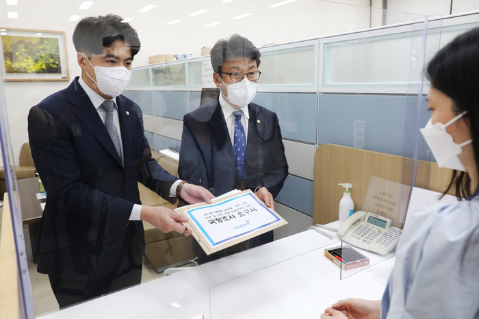 | ▲ 더불어민주당 진성준 원내수석부대표(오른쪽)와 오영환 원내대변인이 17일 오전 국회 의원과에 윤석열 대통령 집무실-관저 관련 의혹 및 사적 채용 진상규명을 위한 국정조사 요구서를 제출하고 있다. 2022.8.17 [국회사진기자단] |