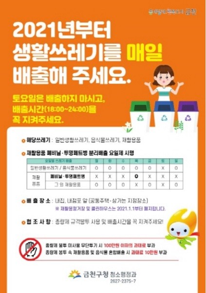 이에 금천구 주민들은 토요일을 제외한 모든 요일에 일반생활 쓰레기, 음식물쓰레기, 재활용품 등 생활 쓰레기를 배출할 수 있다.