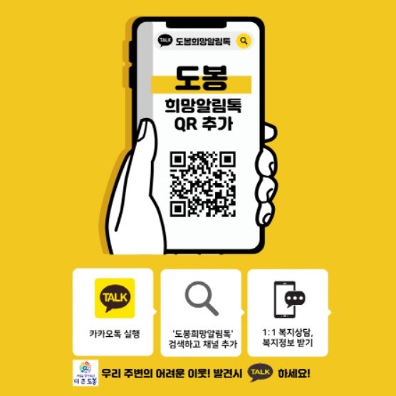 도움이 필요한 주민은 카카오톡 검색창에 '도봉희망알림톡'을 검색한 뒤 친구추가 후 1:1 복지상담을 요청하면, 동 복지플래너가 신속히 상담해 급여 및 서비스 연계, 사례관리대상자(일반, 전문, 위기 사례)로 선정하는 등 맞춤형 지원이 이뤄진다.