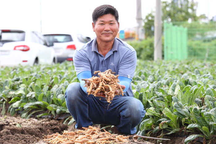 [열린의정뉴스 = 김윤영 기자] 농촌진흥청 국립원예특작과학원이 14일 전북 정읍시 태인면 약용작물 농가에서 지황 새 품종 '한방애'를 소개하는 현장 평가회를 열었다. 사진은 한 농장주가 '한방애' 품종을 들어 보이고 있는 모습. 2022.9.14 [농촌진흥청 제공. 재판매 및 DB 금지]