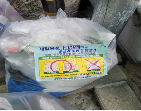 분리배출 요일제를 지키지 않고 버려진 쓰레기들에는 안내 스티커가 붙여지며 다음 수거일에 수거된다.