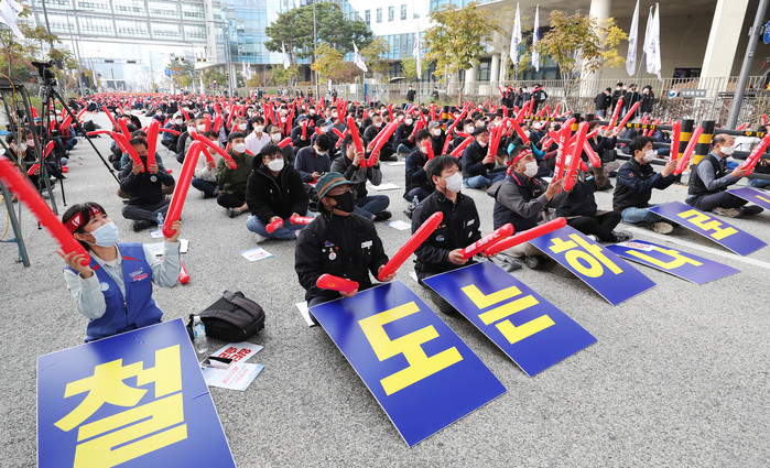 [열린의정뉴스 = 김윤영 기자] 전국 철도노조 관계자들이 4일 오후 세종시 정부세종청사 국토교통부 앞에서 '고속철도 통합, 수서행 KTX 운행을 위한 철도 노동자 총력결의대회'를 열고 구호를 외치고 있다. 2021.11.4