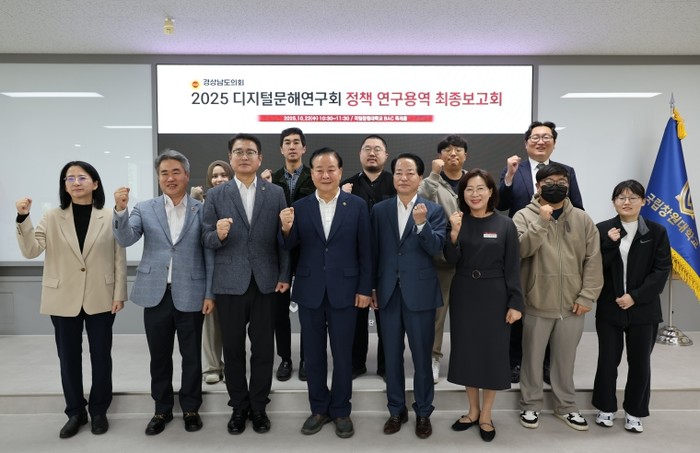 [코리아 이슈저널=김태훈 기자] 경상남도의회 의원 연구단체인 ‘디지털문해연구회(회장 박남용 의원)’는 지난 22일 국립창원대학교 욱재홀에서 '경상남도 디지털 소외 계층을 위한 맞춤형 미디어교육 프로그램 개발 연구' 정책연구용역의 최종보고회를 개최했다.