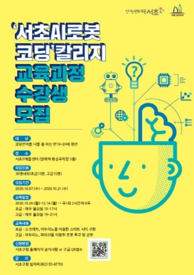 [열린의정뉴스 = 최성일 기자] 서울 서초구(구청장 조은희)는 4차산업 시대의 인재 수요에 발맞추고, 평소 개인이 접하기 어려운 로봇을 직접 실물로 다루며 학습할 수 있도록 서울시 자치구 최초로 '서초 AI로봇코딩 칼리지'를 개설해 오는 26일부터 12월 14일까지 운영한다고 밝혔다.