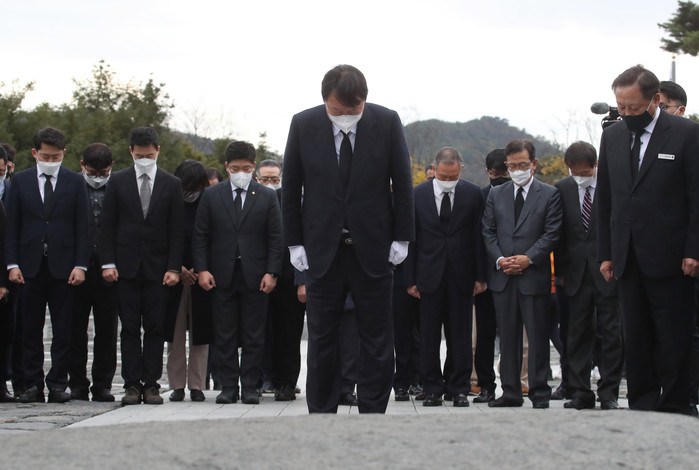 | ▲ 국민의힘 윤석열 대선 후보가 11일 오후 경남 김해시 진영읍 봉하마을 노무현 전 대통령 묘역을 참배하고 있다. [연합뉴스 제공] |
