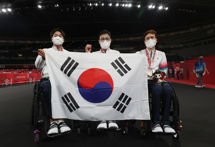 [열린의정뉴스 = 김태훈 기자] 30일 오후 일본 도쿄 메트로폴리탄체육관에서 열린 2020 도쿄 패럴림픽 남자 탁구 개인전(스포츠등급 1) 시상식이 끝난 뒤 금메달을 차지한 주영대(가운데), 은메달 김현욱(왼쪽), 동메달 남기원이 함께 태극기를 들고 포즈를 취하고 있다. 2021.8.30