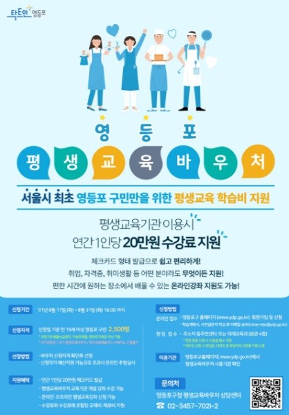 ‘영등포 평생교육바우처’는 개인이 원하는 시기에 원하는 평생교육기관에서 희망하는 프로그램을 자유롭게 수강할 수 있도록 학습비를 지원하는 이용권으로, 올 9월 서울시 자치구 최초 본격 시행을 앞두고 있다.