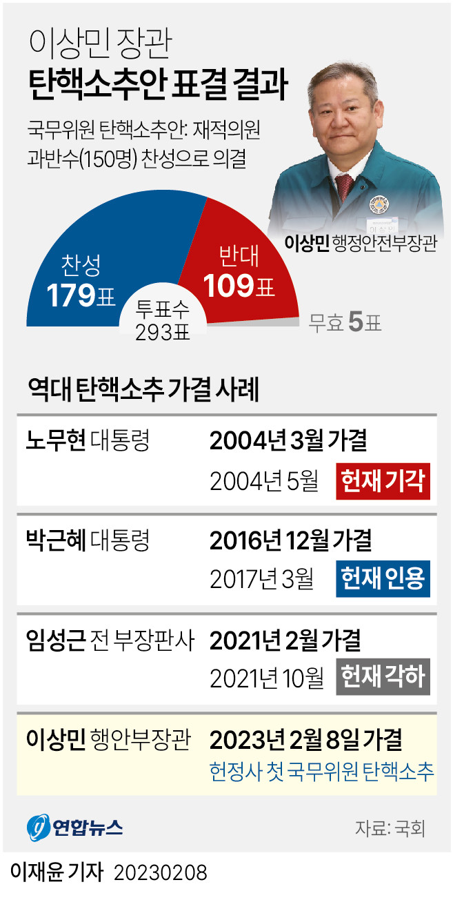 국회는 이날 오후 본회의에서 이 장관 탄핵소추안을 무기명 표결에 부쳐 총투표수 293표 중 찬성 179표, 반대 109표, 무효 5표로 가결해 헌법재판소로 넘겼다.
