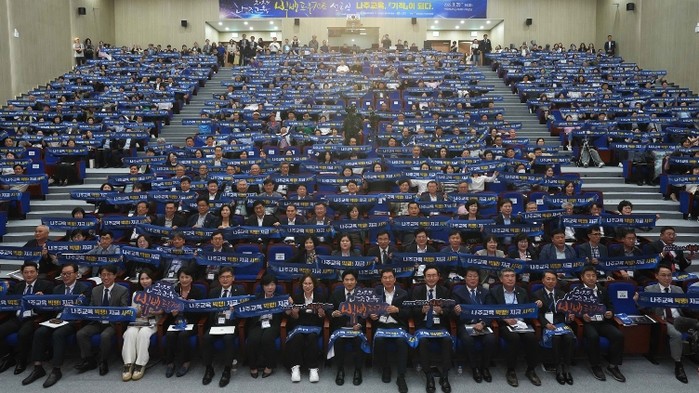 ▲ 2025년 9월 29일 ‘2025 나주교육 빅뱅 프로젝트’ 선포식에 참석한 시민과 관계자들이 단체 퍼포먼스를 선보이고 있다