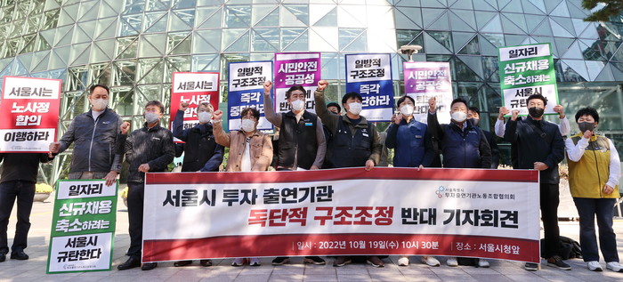 서울시 투자출연기관노조협의회는 이날 오전 기자회견에서 "경쟁식 공공부문 때리기 정책으로 업무가 통폐합되고 외주화되면 시민 안전을 확보할 수 없다"며 "오세훈 시장의 독단적이고 일방적인 통폐합 추진에 반대한다"고 밝혔다.