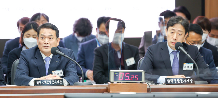 | ▲ 17일 인천 중구 인천국제공항공사에서 열린 국회 국토교통위원회의 인천국제공항공사·한국공항공사 등에 대한 국정감사에서 김경욱 인천국제공항공사 사장이 의원 질의에 답변하고 있다. 오른쪽은 윤형중 한국공항공사 사장. 2022.10.17 |