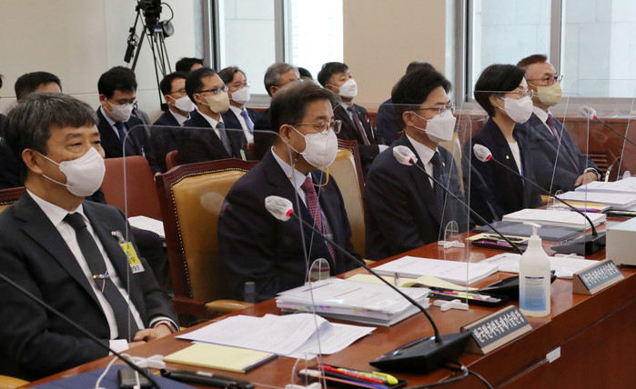 ▲ 황용수 원자력통제기술원장(왼쪽부터), 김석철 원자력안전기술원장, 유국희 원자력안전위원회 위원장, 김제남 원자력안전재단 이사장, 황주호 한국수력원자력 사장이 7일 서울 여의도 국회 과방위 국정감사에서 의원들의 질문을 듣고 있다7일 서울 여의도 국회에서 열린 과학기술정보방송통신위원회의 원자력안전위원회 등 국정감사에서 질의를 듣고 있다. 2022.10.7 [국회사진기자단]