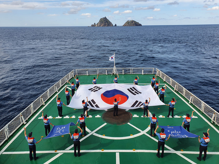 [열린의정뉴스 = 김윤영 기자] 해양경찰청이 제68주년 해양경찰의 날을 맞아 코로나19 극복을 위한 메시지 '코로나19 해양경찰과 함께 이겨내요'를 독도와 울릉도 해상에서 전달했다고 6일 밝혔다. 사진은 지난 2일 독도 해상의 해양경찰 5001함에서 메시지를 전하는 함승조원들. 2021.9.6