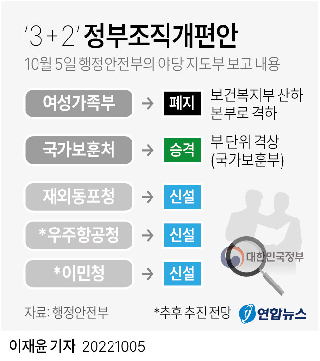 여성가족부 폐지, 국가보훈부 승격, 재외동포청 신설 등 당장 추진하는 3가지에 향후 추진할 우주항공청·이민청 신설 등 2가지를 더한 것이다.