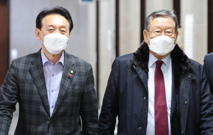 ▲ 국민의힘 유흥수 선거관리위원장(오른쪽)과 선거관리부위이원장인 김석기 사무총장이 3일 국회에서 열린 전당대회 선관위원회 2차 회의에 참석하고 있다. 2023.1.3