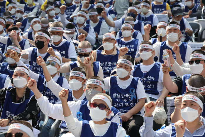[열린의정뉴스 = 김윤영 기자] 발달장애인과 가족 550여 명이 19일 오후 청와대 인근에서 전국장애인부모연대 주최로 열린 발달장애인 24시간 지원 체계 구축을 위한 1박2일 집중 결의대회에서 단체 삭발을 마친 뒤 구호를 외치고 있다. 2022.4.19