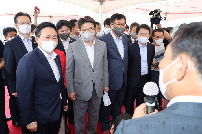 | ▲ 국민의힘 권성동 원내대표와 성일종 정책위의장 등 지도부가 3일 오전 세종시 세종동 국회 세종의사당 예정부지를 방문, 최민호 세종시장으로부터 설명을 듣고 있다. 앞줄 왼쪽부터 원희룡 국토교통부 장관, 권 원내대표, 정진석 국회부의장, 성 정책위의장. 2022.8.3 |