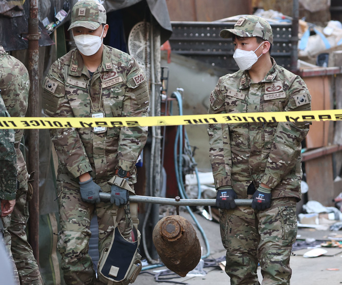 [열린의정뉴스 = 김윤영 기자] 7일 오후 서울 마포구 신수동의 한 고물상에 폭발물로 의심되는 철제 물품이 발견됐다는 신고가 들어와 군 폭발물 처리반(EOD)이 출동, 폭발 의심 물체를 옮기고 있다. 2021.12.7
