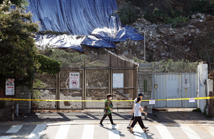 [열린의정뉴스 = 김윤영 기자] 16일 오후 시민들이 폭우로 인해 산사태가 발생한 서울 동작구 경문고등학교 후문 앞을 지나가고 있다. 2022.8.16