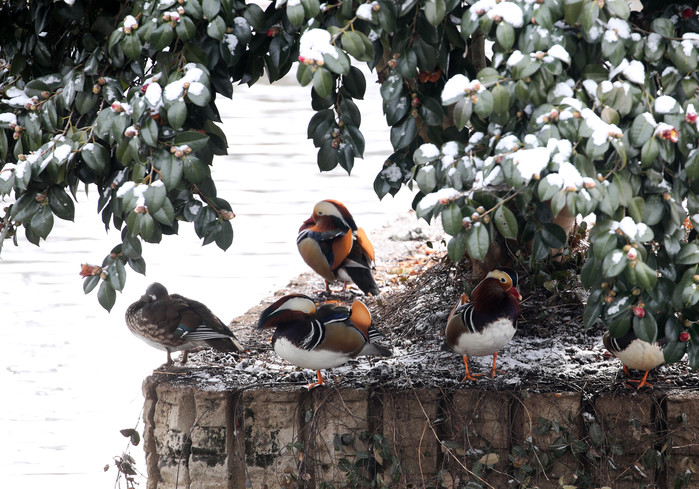 [열린의정뉴스 = 김윤영 기자] 22일 광주 북구 전남대학교 연못에서 원앙들이 동백나무 아래서 휴식하고 있다. 2022.12.22