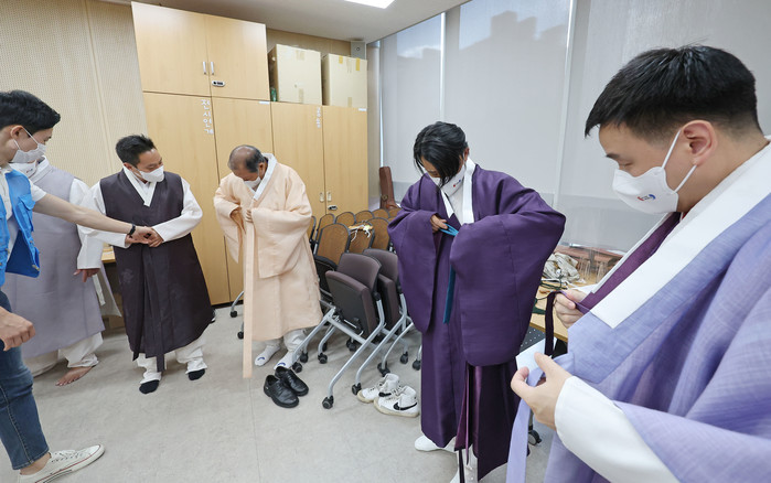 [열린의정뉴스 = 김윤영 기자] 16일 오후 서울 용산구 국립한글박물관에서 미국과 카자흐스탄 등에 거주 중인 독립유공자 후손들이 한복을 입어보고 있다. 2022.8.16