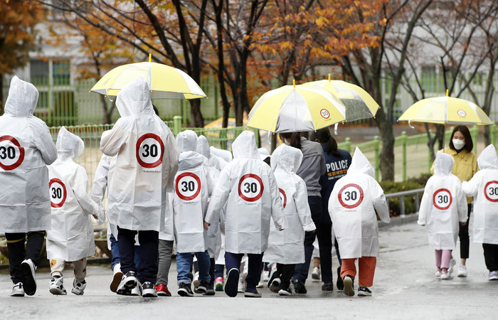 [열린의정뉴스 = 김윤영 기자] 11일 오후 광주 북구 운암동의 한 초등학교에서 학생들이 교통안전 캠페인을 펼치고 있다. 광주 북구청은 학생들에게 우비를 배부하고 유관기관과 함께 캠페인을 펼쳤다. 2021.11.11