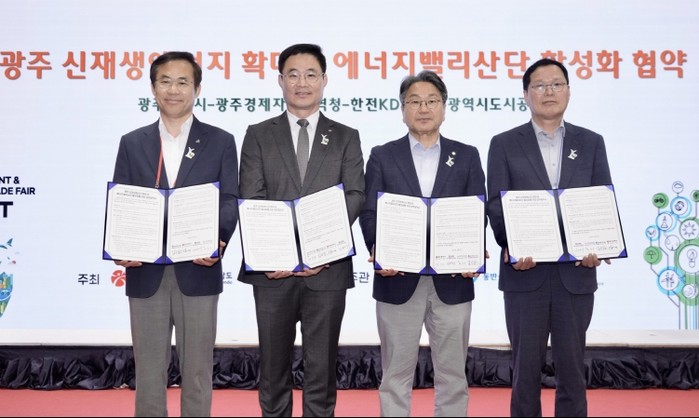 광주광역시는 9일 김대중컨벤션센터에서 광주경제자유구역청(청장 선석기), 한전KDN㈜(사장 박상형), 광주도시공사(사장 김승남)와 ‘광주지역 신재생에너지 확대 및 에너지밸리산단 활성화를 위한 업무협약(MOU)’을 체결했다.