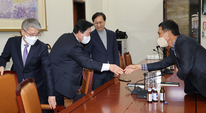 | ▲ 국회 연금개혁특별위원회 여야 간사와 민간자문위원회 공동위원장들이 8일 오후 국회 보건복지위원회에서 연금개혁 초안 문제 등을 논의하기 위해 회동하며 인사하고 있다. 왼쪽부터 김용하 민간자문위 공동위원장, 강기윤 국민의힘 간사, 김성주 더불어민주당 간사, 김연명 민간자문위 공동위원장. 2023.2.8 |