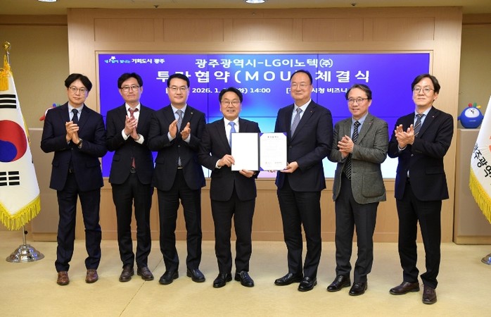 [코리아 이슈저널=김종오 기자] 광주광역시와 LG이노텍은 13일 시청 비즈니스룸에서 ‘차량용 제어모듈 신규 생산라인 구축을 위한 투자협약’을 체결했다. 이번 협약은 2026년 새해 부강한 광주로의 힘찬 도약을 알리는 첫 신호탄이다.