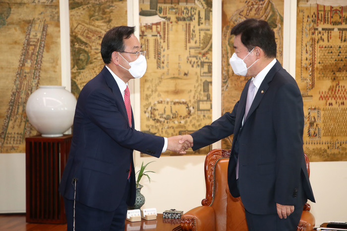 | ▲ 김진표 국회의장이 21일 오전 국회 의장집무실을 예방한 국민의힘 주호영 원내대표와 인사를 나누고 있다. 2022.9.21 [국회사진기자단] |