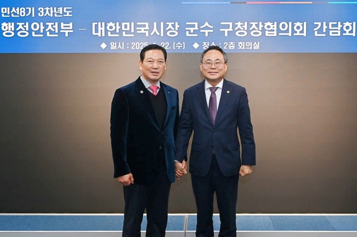 조재구 대한민국시장·군수·구청장협의회 대표회장과 고기동 행정안전부 장관 직무대행은 오늘 면담을 계기로 중앙정부와 기초자치단체 간 긴밀한 유대관계를 바탕으로 주민의 행복과 안전, 지역의 미래를 위해 실질적인 협력을 더욱더 강화하기로 했다.