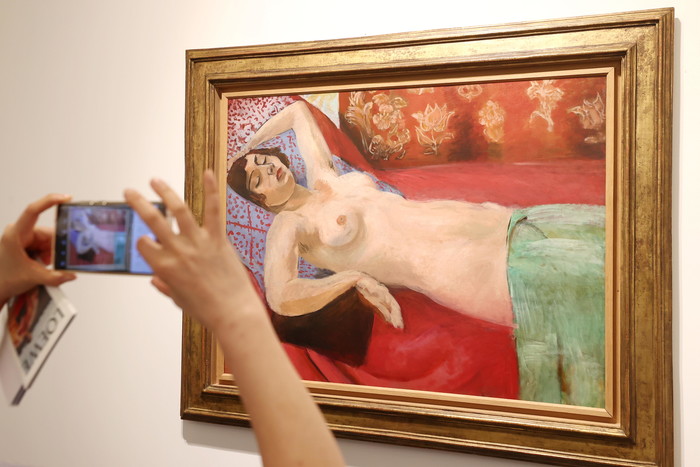 [열린의정뉴스 = 김윤영 기자] 2일 오후 서울 강남구 코엑스에서 열린 아트페어 '프리즈 서울'에서 한 관람객이 앙리 마티스의 '녹색 숄을 걸친 누드' 작품을 촬영하고 있다. 2022.9.2