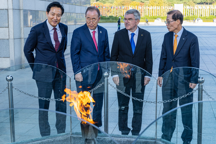 [열린의정뉴스 = 김윤영 기자] 토마스 바흐 IOC 위원장(왼쪽 세번째), 반기문 전 유엔사무총장(왼쪽 네 번쨔)과 오세훈 서울시장이 18일 오후 서울 송파구 올림픽 공원 내 평화의 문을 찾아 1988년 서울 올림픽이후 계속 타오르고 있는 세계 평화의 성화에 대한 조현재 국민체육진흥공단 이사장의 설명을 듣고 있다. 2022.10.18