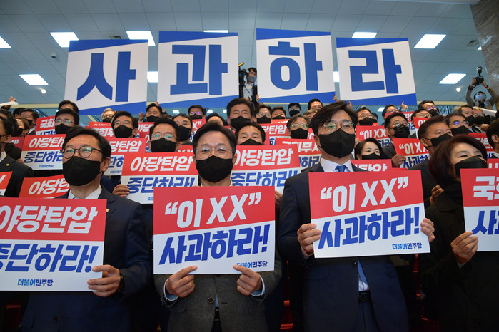 시정연설 불참을 결의한 민주당은 본회의장으로 향하는 본관 로텐더홀에 집결해 '국회무시 사과하라!', '이 XX 사과하라!'라는 내용이 적힌 손팻말을 들고 "민생외면 야당탄압, 윤석열 정권 규탄한다"라고 외치기도 했다.